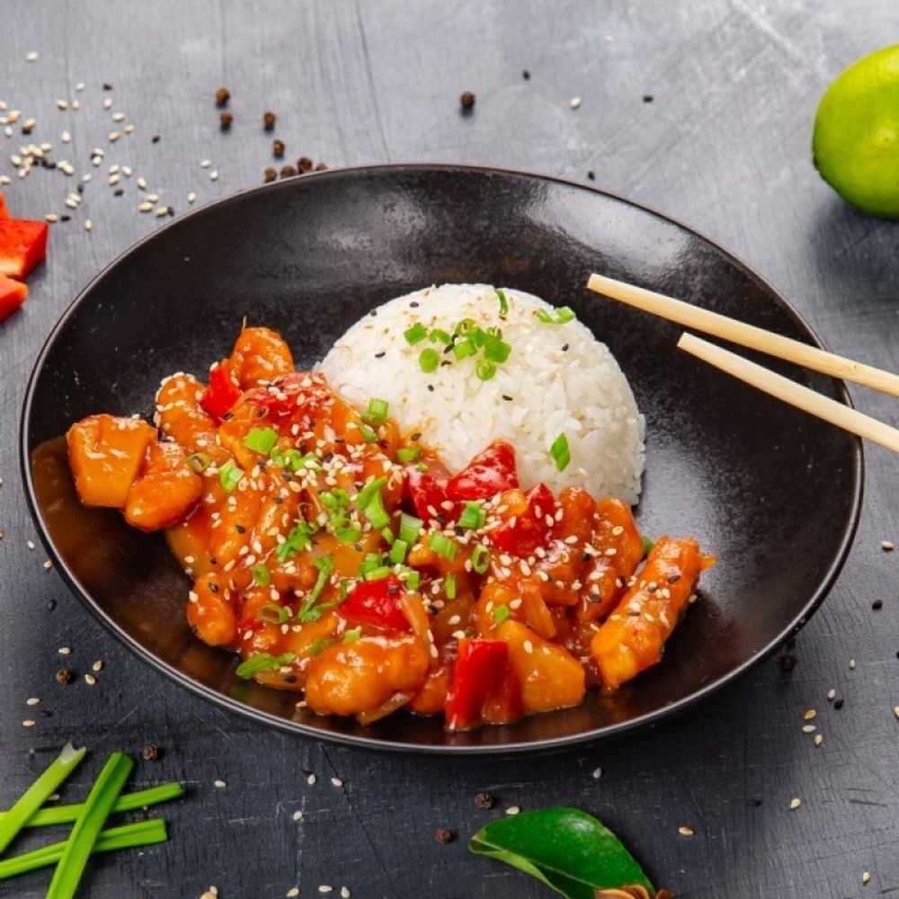 Курица в кисло-сладком соусе и рис